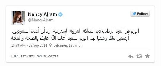 نانسي عجرم كانت من المهنئين ايضاً رغم الجرح الذي أصابها بعينها ودخولها المستشفى، فكتبت على حسابها على تويتر: