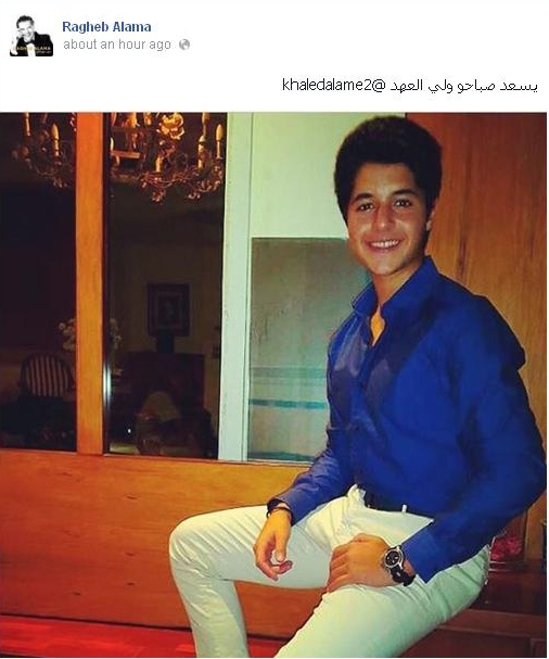نشر السوبر ستار راغب علامة صباح اليوم صورة عبر صفحته الرسمية على "فيسبوك"، تعود لابنه البكر خالد وقد لقّبه بـ "ولي العهد"، ملقياً عليه التحية الصباحية أمام أعين المعجبين، فقام البعض بالتحدّث عن الشبه بين الوالد والابن، فيما أشاد البعض الآخر بالولاية التي يرأسها "الملك الأكبر" راغب وولي العهد، أي خالد.
