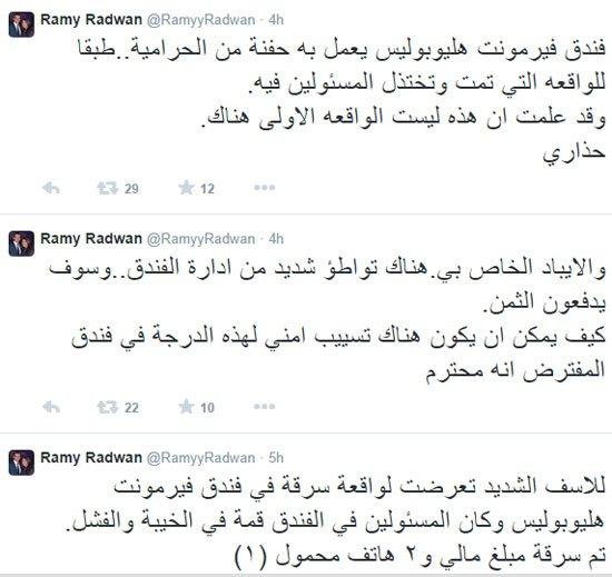 تعرضت النجمة الشابة دنيا سمير غانم وزوجها الإعلامىي رامي رضوان للسرقة، منذ قليل، بأحد فنادق مصر الجديدة، وذلك أثناء حضورهما حفل زفاف أحد أصدقائهما هناك، حسب ما جاء في صحيفة اليوم السابع. إذقام رامي ودنيا بحجز غرفة بالفندق، وأثناء انشغالهما بحفل الزفاف تمت سرقة هواتفهما المحمولة، فضلاً عن جهاز "أي باد" و7 آلاف جنيه مصري. وعبر رامي رضوان، عبر صفحته على تويتر، عن غضبه الشديد بعد تعرضه للسرقة ووبخ إدارة الفندق، خاصة بعد فشل أمن الفندق فى إرجاع محتوياته المسروقة، وهدد رضوان إدارة الفندق بأنه لن يترك الأمر يمر مرور الكرام، بل سيدفعهم الثمن غاليًا، ثم سارع رامي بكتابة ما تعرض له على حسابه الخاص على تويتر.