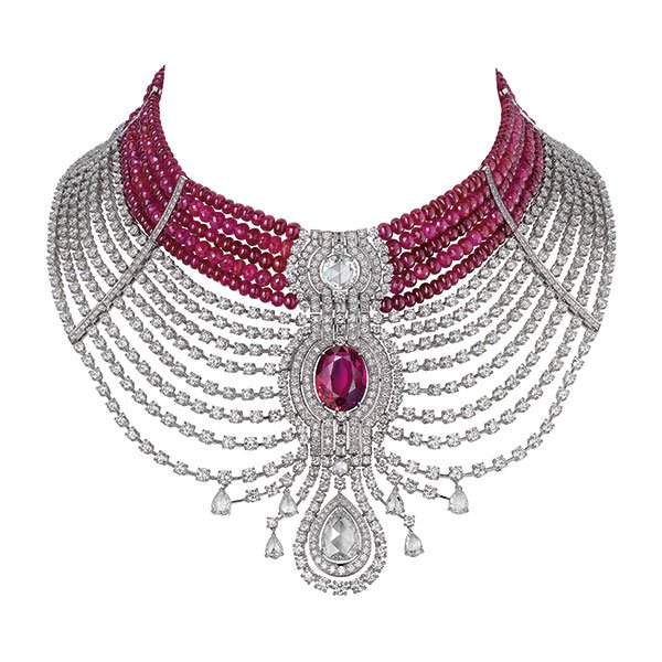 بين كنوز كارتييه برزت أيضاً الياقوتة الإفريقية المشتعلة باللون الأحمر التي يحتفل شكلها وهندستها بإبداع عمل حرفي حوّلها إلى جوهرة مركزية ضمن شلال من الجواهر ينساب بسلاسة حول عنق محظوظ.