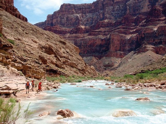 مخترقًا أرياف جميلة وجبالاً مهيبة تحديداً غراند كانيون، هذه الجبال الشاهقة عجيبة من عجائب الطبيعة يتسرب بين أقدامها نهر كولورادو وأحيانًا يدور حولها، فلا هو يتعب ولا هي تشعر بالدوار.