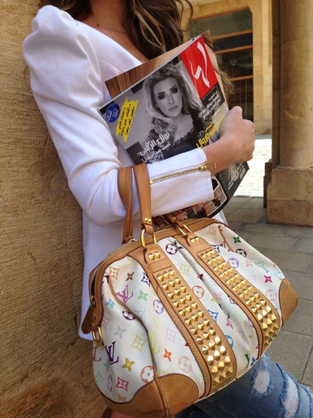 بعيداً عن العمل، اختارت أنابيلا هلال الجينز الممزّق مع بلوزة من القطن باللون الأبيض مرصّعة بالأحجار. ولتحافظ على أناقتها، أضافت سترة باللون الأبيض أيضاً مع سحاّب ذهبيّ عند الكمّين، وحزام رفيع ملوّن. أمّا حقيبتها، فهذه المفضّلة لديها، وهي حقيبة Louis Vuitton الملوّنة.