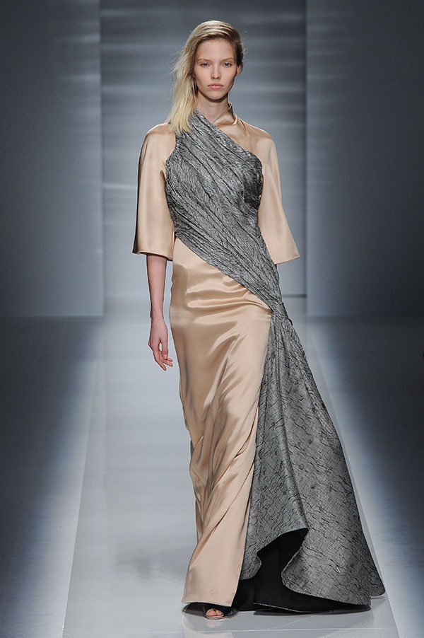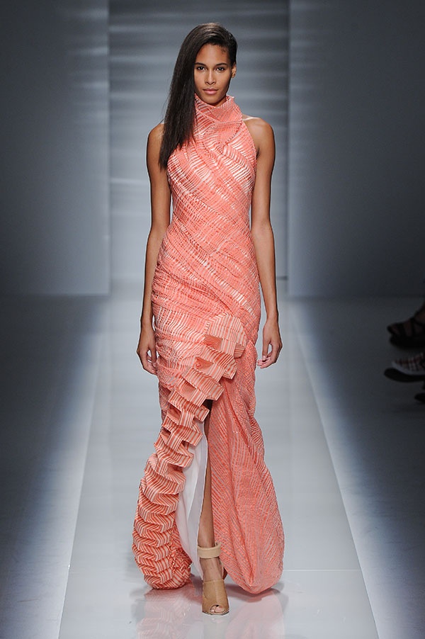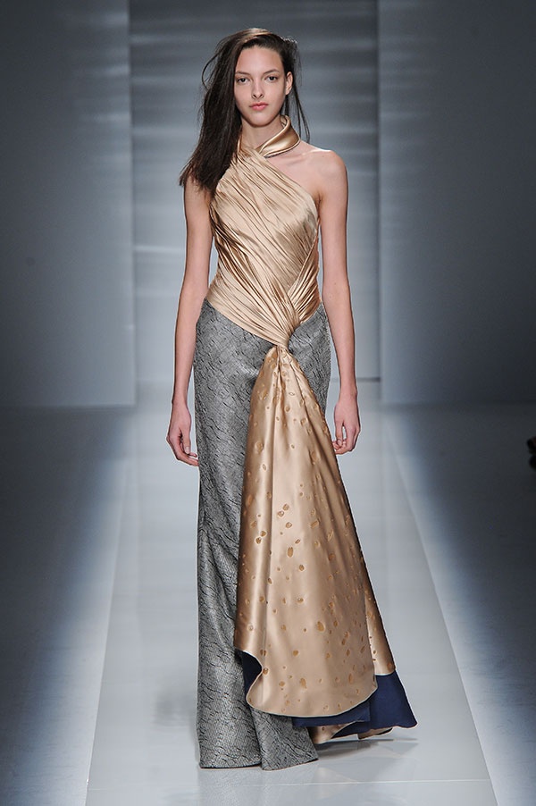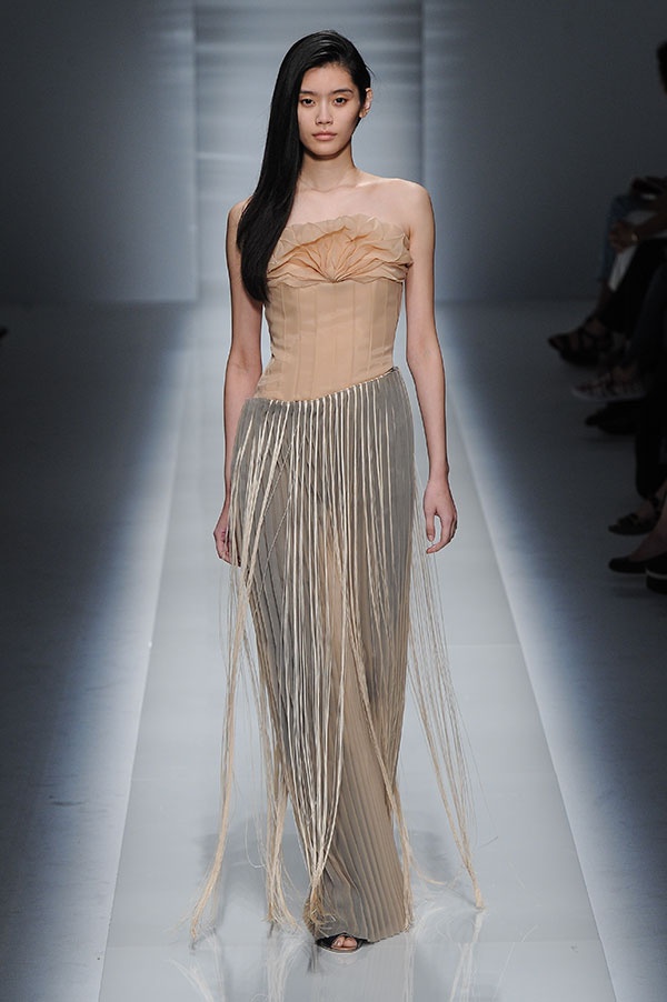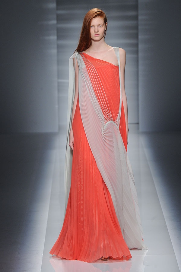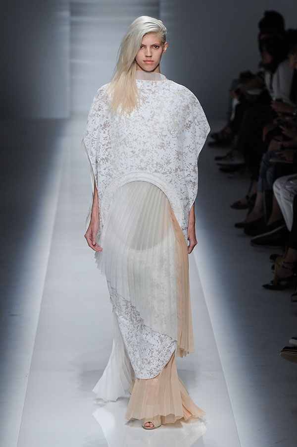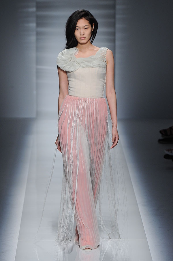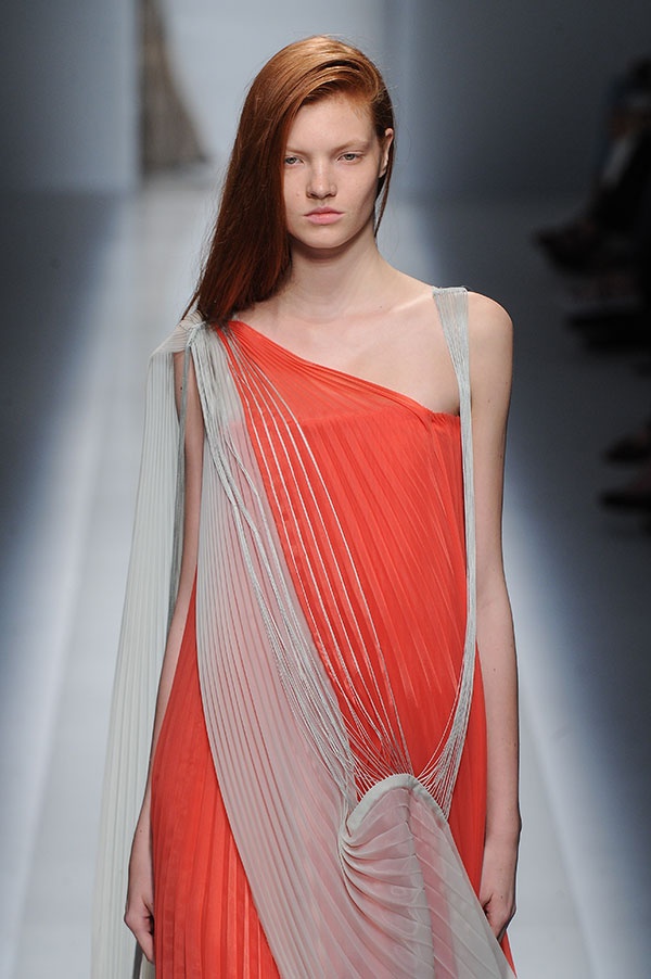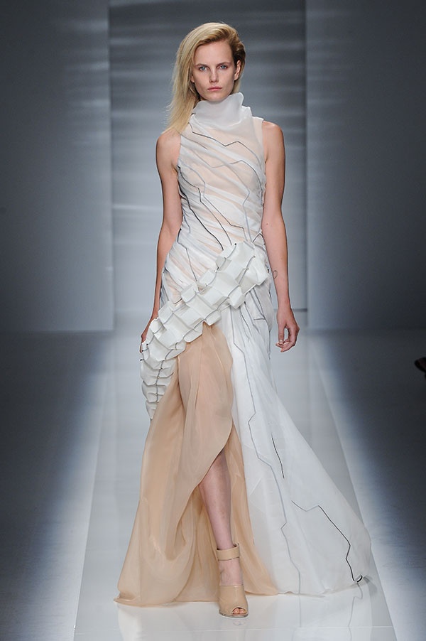 مجموعة فيونيه Vionnet كشفت عن نعومة لافتة وامتازت الفساتين بقصات مائلة وثنيات مجهرية أضافت الحركة إلى كل فستان. ثمة لمسة هندسية في كل فستان مذهل فيما تمايل مع جسم العارضة بلونه الدقيق.