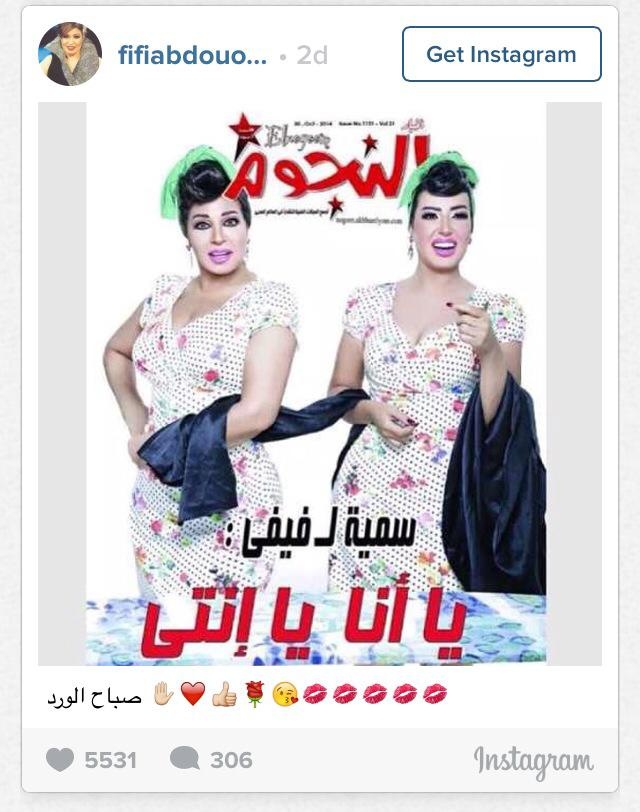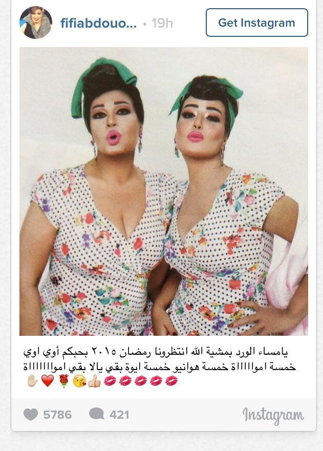 نشرت النجمة فيفي عبده صورة تجمعها بالنجمة التي خسرت 20 كيلوغراماً من وزنها أخيراً سميّة الخشاب وكتب على الصورة: فيفي عبده لسميّة الخشاب "يا أنا يا إنت".