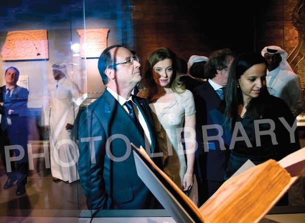 ودشّن هولاند مدرسة «فولتير» حيث ألقى كلمة أمام الجالية الفرنسية التي يبلغ عديدها حوالي 3500 شخصاً، كما زارت السيدة الأولى مركز الشفلّح للأطفال ذوي الاحتياجات الخاصة. وفي نهاية زيارتهما القصيرة للدوحة، قصد هولاند وفاليري متحف الفن الإسلامي، واطّلعا خلالها على مقتنيات المتحف الذي يحتضن روائع الفن الإسلامي، من مشغولات معدنية وخشبية وخزف ومجوهرات ومنسوجات ومسكوكات وزجاج. شارك