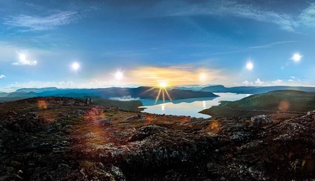 مشهد مهيب لتداخل الأرجواني برمادية الغيوم، إنها الثانية عشرة منتصف الليل والشمس تتباهى بأنها لا تزال مشرقة غير آبهة لتواتر الليل والنهار.