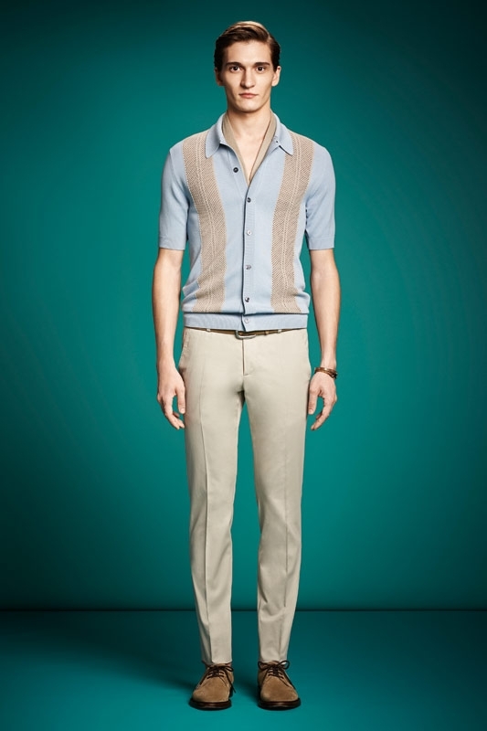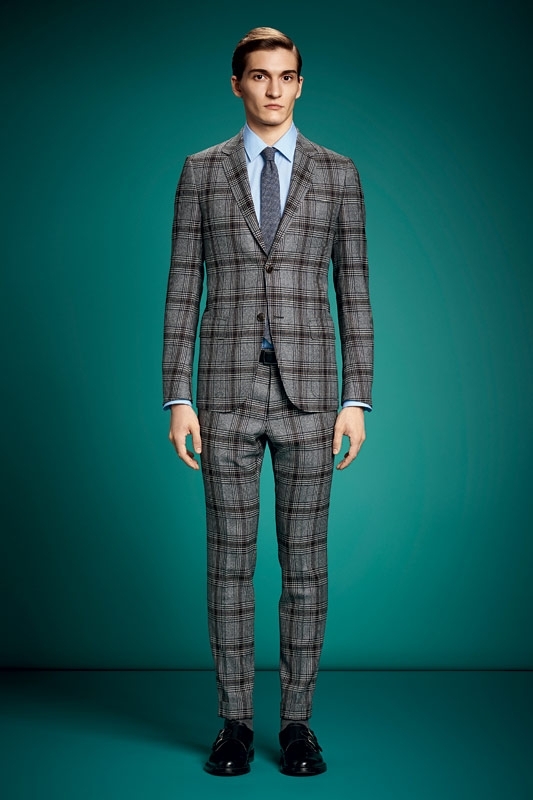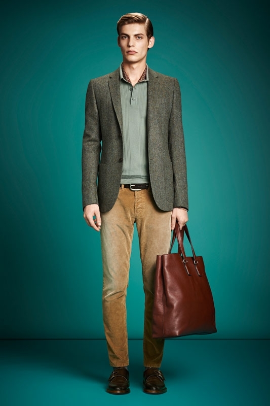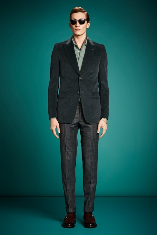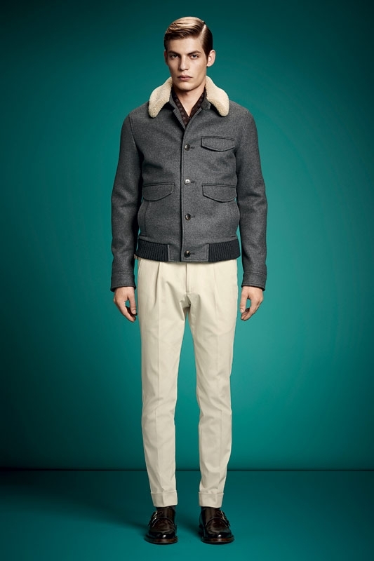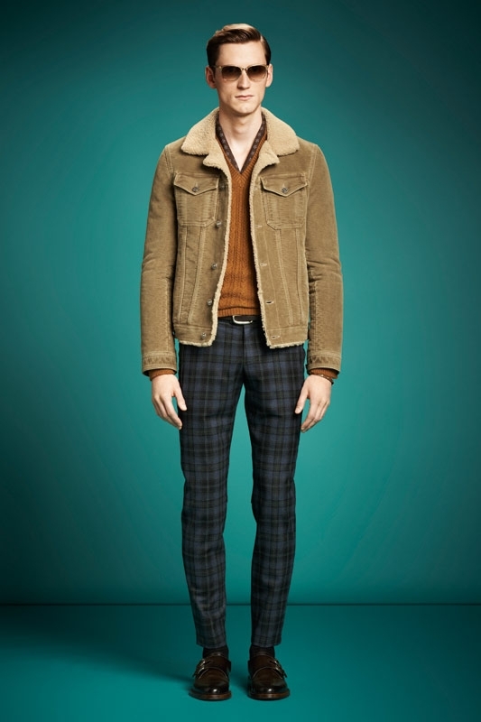 في مجموعة ما قبل خريف 2013، تأخذ Gucci الرجل إلى مساحة سريالية من البساطة العصرية. الجو العام يذكّرنا بحقبة الخمسينيات من القرن العشرين عبر سترات ثنائية الأزرار وسراويل ضيقة في الأسفل. سترات غير مبطنة، وقمصان مزينة بدرزات، وكنزات متعددة الجيوب من النايلون المطبع. معاطف بياقات مخملية، ومعاطف واقية من المطر، ومعاطف مطبعة بمربعات.