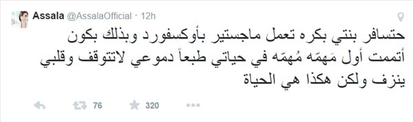 أعربت المطربة أصالة نصري عن حزنها وألمها بسبب سفر ابنتها شام إلى جامعة أوكسفورد في بريطانيا، لاستكمال دراستها، وقالت عبر حسابها الخاص على موقع التواصل الاجتماعي تويتر: "حتسافر بنتي بكره تعمل ماجستير بأوكسفورد، وبذلك بكون أتممت أول مَهمّة مُهمّة في حياتي طبعاً. دموعي لا تتوقف وقلبي ينزف، لكن هكذا هي الحياة".