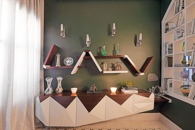 كما صمّمت مكتبة كبيرة موازية للصوفا الرئيسية في الصالون لتضم جهاز تلفزيون. وهي مصنوعة من الخشب الابيض اللامع بخطوط ملتوية ومستقيمة مع خلفية خضراء لبعض المساحات.
