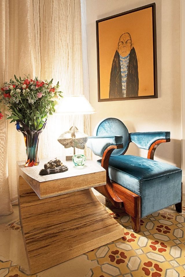 في غرفة الجلوس تلفتنا أعمال من خشب تلف الجلسات. كما تعكس الصوفا والطاولة وزوايا الأمكنة روح الستينات بعصرية فنية متميزة.