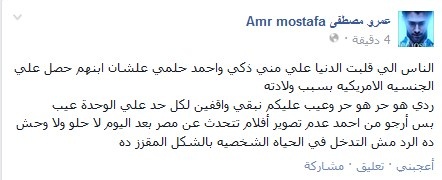 اعتذار عمرو مصطفى جاء من خلال حسابه على فيس بك، حيث كتب: "زعلت جداً أن فناناً بحجم أحمد حلمي يضع مولوده الجديد بأميركا، ولم أكن أعلم بظروفه الصحية، وده كان بدافع غيرتي على بلدي، لكن بعد علمي بتعبه وظروفه الصحية وجب عليَّ الاعتذار له ولأسرته".