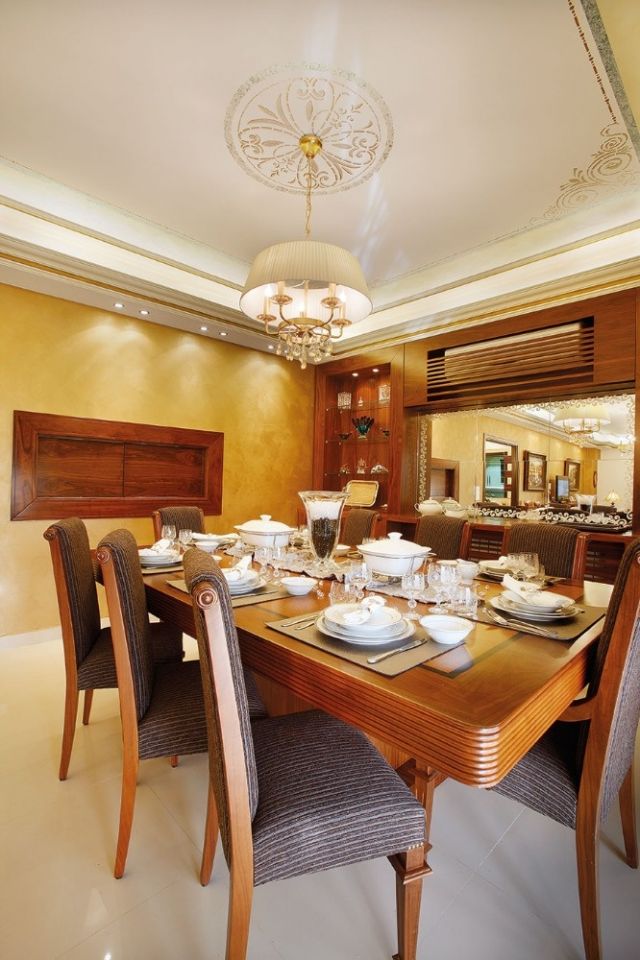 غرفة الطعام مميزة بطرازها حيث الكراسي مخططة القماش وتبرز اطرافها مزدانة بورود خشبية تحاكي «فيترين» خشبية تتوسطها مرآة.