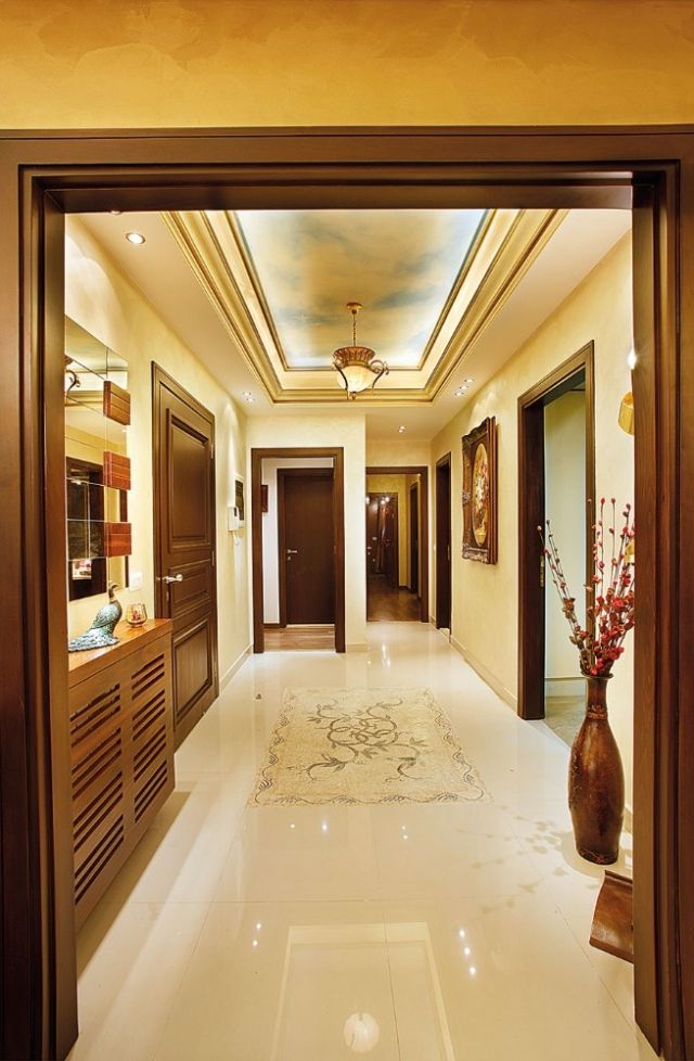 ازدان السقف في قسم الاستقبال كما في الردهة وغرفة الطعام برسوم خجولة تعكس لمسات فنية ناعمة ومتميزة. اما الأكسسوارات فصنعت من المورانو الإيطالي الذي أضفى أجواء باهرة وبراقة.