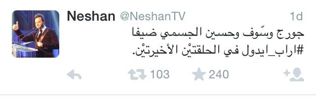 على حسابه على موقع التواصل الاجتماعي تويتر غرّد الإعلامي نيشان قائلاً إن ضيوف الحلقة الأخيرة من أراب آيدول Arab Idol سيكونان حسين الجسمي وجورج وسوف.