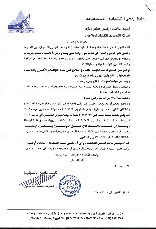 وقد تقدمت شركة «المتحدين» بشكوى لنقابة المهن التمثيلية التي أصدرت بدورها قراراً بتأكيد استمرار إيقاف أي تصاريح عمل للفنان محمد رمضان.