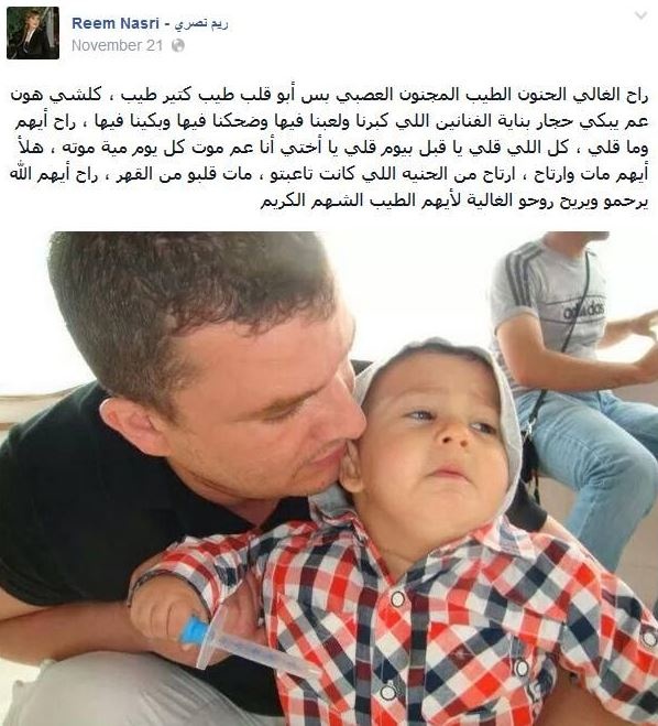 "يا حبيبي تعا لقلبي أنا أختك بحبك يا أخييييييييي وين تركتني وتركت مصطفى يا أيهم ليش رحت الله يريح روحك كنت تعبان يا أخي يارب هلأ تكون ارتحت ارتاح يا أخي ارتاح يا حبيبي"