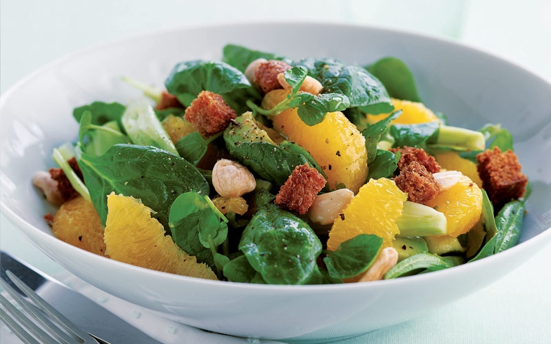 2. توضع كل المكونات الأخرى في وعاء، على أن يضاف زيت الأفوكادو وعصير البرتقال في النهاية. يضاف القليل من الفلفل الأسود المطحون حديثاً، والقليل من الملح. تخلط المكونات كلها مع بعضها وتنثر فوقها مكعبات الخبز المحمصة. تقدم السلطة على الفور.