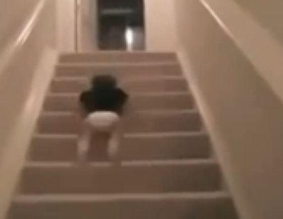 انتشر على مواقع التواصل الاجتماعي فيديو لطفل صغير أراد أن يأخذ زجاجة الحليب من والده فتزحلق على الدرج ليصل بثوانٍ إلى الزجاجة مخاطراً بنفسه.