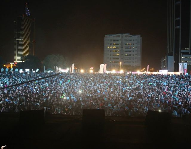 وحرص عمرو أيضاً على أن يداعب فرقته الموسيقية، بمشاركتهم العزف على آلاتهم، بينما فاجأته إحدى المعجبات الحاضرات الحفل، بلوجة تضم رسماً لوجوه أبنائه الأربعة.