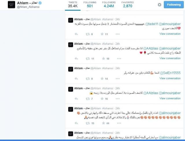 وفي تغريدة أخرى قالت: "للأسف الصوت بلا إحساس مثل الوردة بلا ريحة".