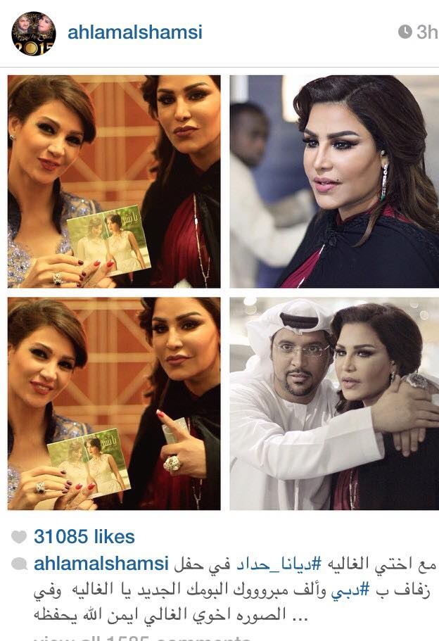 كما نشرت أحلام صوراً إلى جانب النجمة اللبنانية ديانا حداد، وباركت لها بألبومها الجديد وأرفقت الصور بالقول :" أختي الغاليه ديانا حداد في حفل زفاف في دبي وألف مبروك ألبومك الجديد يا الغالية.. وفي الصوره أخوي الغالي أيمن الله يحفظه ".