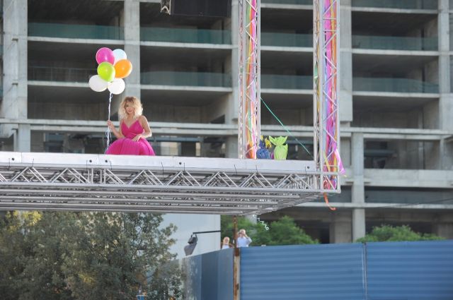 ونرى نوال تجول الشوارع حاملة بالونات الهيليوم الى أن تصل الى مسرح ضخم يرتفع بها في سماء العاصمة في مشهد إحتاج لجرأة كبيرة من نوال وجهد كبير من فريق العمل لتنفيذه وإستخدمت فيه آلاف البالونات. وكانت نوال رفضت إعتماد بديلة أثناء تصوير هذا مشهد على الرغم من خطورة لحظة رفع المسرح في الهواء.