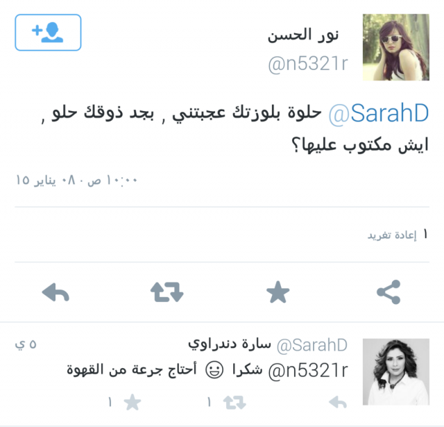 شغلت "تي شيرت" سوداء اللون كانت ترتديها الإعلامية السعودية سارة دندراوي، خلال تقديم برنامجها "صباح العربية" متابعي موقع التواصل الاجتماعي "تويتر"، حيث تهافتت على صفحتها الردود والاستفسارات حول المكتوب على ملابسها، ليتبين فيما بعد أن الجملة تعكس عشق سارة للقهوة، ومكتوب على التي شيرت"أحتاج جرعة من القهوة"، وهي من تصميم الرسامة السعودية الشابة ولاء فاضل، التي تميزت بمشروعها Geminitshirts المعروف على وسائل التواصل الاجتماعي، وتعمل من خلاله في الرسم على الملابس، والقطعة التي ارتدتها سارة من مجموعة تحمل اسم "أحتاج" مستوحاة من قصائد للشاعر الراحل محمود درويش وحبه للقهوة.