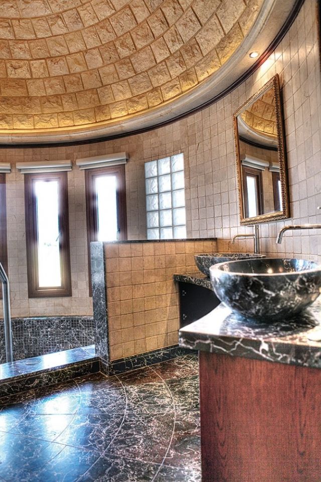 ويضم جلسة من رخام مع طاولة مماثلة، وتتوسطه «جزيرة» فيها مغسلة وخزائن، إضافة الى خزائن أخرى تناغمت مع خطوط خشبية فنية وألوان امتدت حتى السقف.