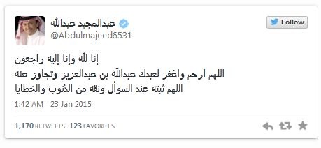 بعد انتشار خبر وفاة الملك عبد الله بن عبد العزيز عن عم ٩٠ عاماً، نعى الفنانون الراحل وتشاركوا مع الشعب السعودي في مصابهم الجلل.