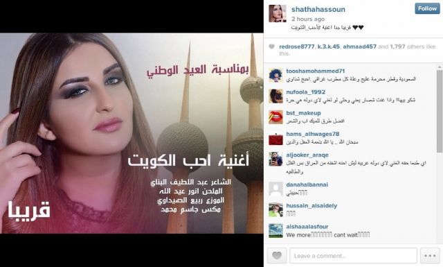 بعد نشر النجمة الإماراتية أحلام مقطع فيديو لأغنية جديدة ستطلقها في العيد الوطني لدولة الكويت، نشرت النجمة العراقية شذى حسون صورة على حسابها على موقع التواصل الإجتماعي إنستغرام تعلن فيها عن إطلاق أغنية جديدة للمناسبة نفسها.