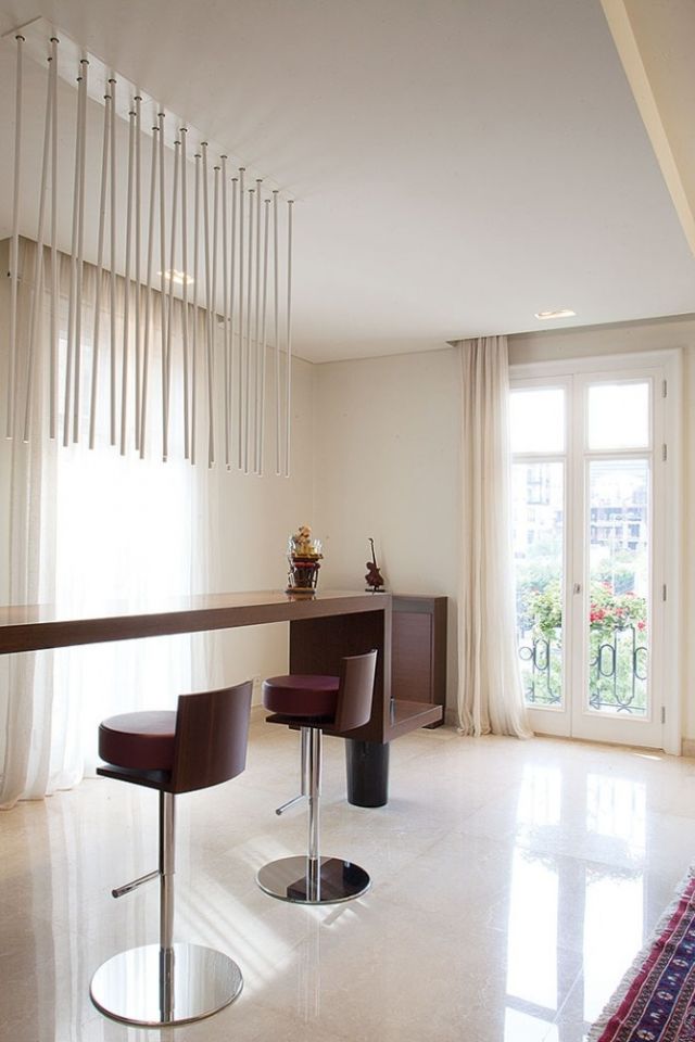 الطاولة والكراسي من ماركة عالمية، أما الدروسوار فهو من تصميم المهندسة خليل التي زيّنته بإدخال مستطيلات وركائز من الكروم، وصمّمت فوق الدروسوار مرآة مبتكرة خماسية الأضلاع. أما الثريا فهي ملتصقة بالسقف، عبارة عن مجموعة دوائر، انبعثت الإنارة من كلّ دائرة منها. وفي هذا الجوّ العصري، لم يغب السجاد الحرير بألون زاهية ورسوم مائلة إلى العصرية.
