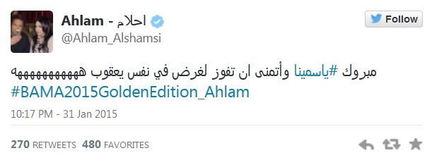 وختمت قائلة: «اتمنى ان تفوز ياسمينا لغرض في نفس يعقوب، ههههه».