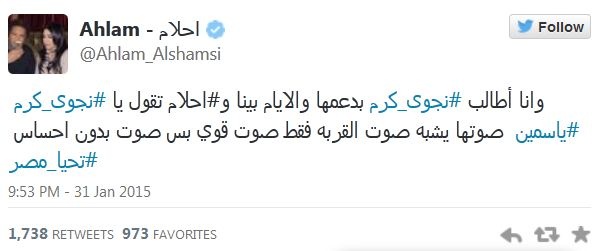 "وانا اطالب نجوى كرم بدعمها والايام بينا واحلام تقول يا نجوي كرم، ياسمين صوتها يشبه صوت القربه فقط صوت قوي بس صوت بدون احساس».