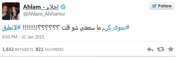 واردفت: «الا بسال نجوي كرم كيف عرفتي اني قلت إن صوتها مستعار وكيف تسالي علي جابر ليه اِيش قالت احلام ههههههههههه، الله يرحم ام كلثوم، نقطه ع السطر»