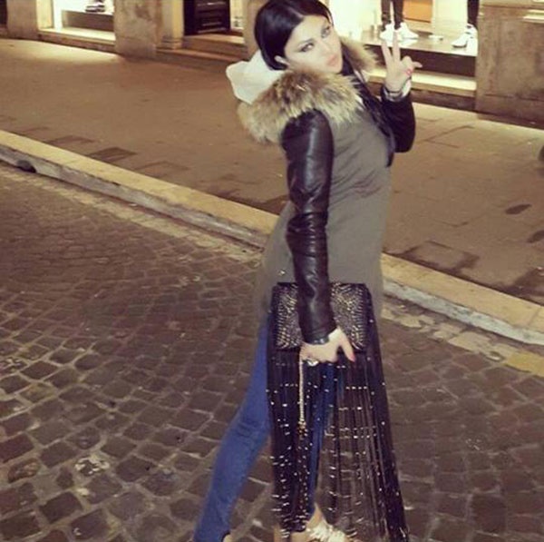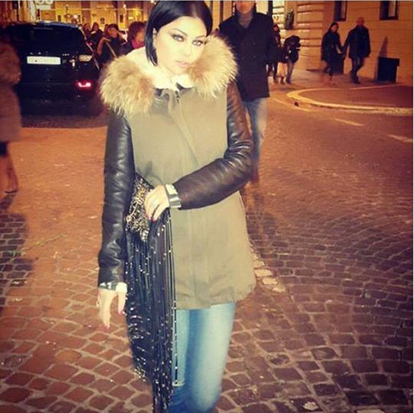 هيفا التي حملت حقيبة حد غريبة وفريدة من تصميم روبيرتو كفالي Roberto Cavalli بلون بني غامق مع أزرار ذهبية ويتدلى منها شراشيب، تميّزت إطلالتها بالبساطة والأناقة معاً، فارتدت الجينز الأزرق ومعطف جلدي بني اللون، وسترة بيج زيّن عنقها بالفرو.