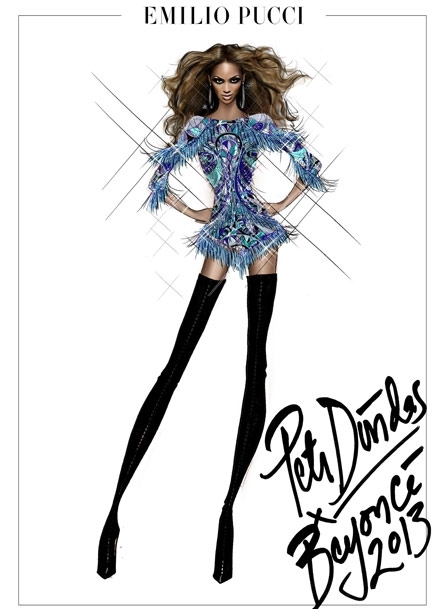 قام بيتر دونداس- المدير الإبداعي لدار Emilio Pucci بتصميم أزياء للنجمة بيونسي، بعد أن رافقها إلى البروفات قبل حفلتها، ضمن جولة The Mrs. Carter Show. النتيجة كانت أزياء أنيقة وجذّابة تليق بجمال بيونسي وحيويّتها.