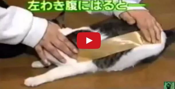 فالرجل يقوم بتجربة لصق الشريط اللاصق على القطة.