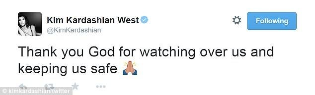 ولم يصب أي من ركاب السيارة الأربعة بأذى، الأمر الذي جعل كيم كارداشيان تنشر صورة لمكان الحادث على موقع "تويتر" مرفقة بتغريدة كتبت فيها " الحمد لله الذي أنقذنا وحفظنا سالمين".