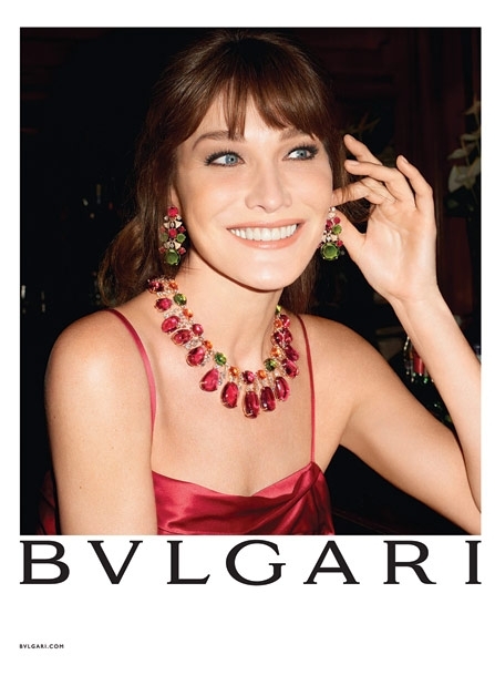 وكشف كاتيجباك أن عدداً كبيراً من التصاميم جرى بيعه تلك الليلة. وبالإضافة إلى المجوهرات، تضم المجموعة حقائب فاخرة ونظارات وساعات. أكثر من مجرد ملهمة، رافقت السيدة بروني-ساركوزي الدار، التي تملكها LVMH، إلى مدينة بورتوفينو الإيطالية حيث جرى إطلاق المجموعة قبلاً، وسوف تكون أيضاً الوجه الرئيسي في الحملة الإعلانية الجديدة للمصوّر الأميركي تيري ريتشاردسون في روما. والواقع أن نظرة سريعة الى الصور الإعلانية تكشف بروني-ساركوزي جذابة وفاتنة وهي ترتدي فستاناً أرجوانياً بسيطاً مع عقد ماسي من المجموعة. وعند الحديث عن سبب اختيار المغنية والسيدة الأولى لتكون سفيرة الماركة، يشرح جان كريستوف بابين، المدير العام التنفيذي لدار Bulgari، إنها «امرأة مستقلّة ومثقفة جداً، فنانة بحد ذاتها، والأكثر من ذلك إنها إيطالية». تجدر الإشارة إلى أن بروني-ساركوزي عرضت قبلاً تصاميم لدور أزياء مهمة في حقبة التسعينيات، ومنها Chanel وYves Saint Laurent وChristian Dior، قبل أن تتخلّى عن مهنة عرض الأزياء وتتحول إلى الموسيقى. ورغم التوقف القصير عام 2008، عادت إلى الموسيقى وأطلقت ألبوم الـ «بوب»، «أغانٍ فرنسية صغيرة» (Little French Songs).صحيح أنها ليست أول زوجة رئيس تنخرط في عالم الأزياء، لكنها تضيف بلا شك نفحتها الخاصة من الأناقة الباريسية إلى ماركة Bulgari وتسهل معرفة سبب انتقال الدار من نجمات الماضي إلى بروني-ساركوزي التي تجسّد المفهوم العصري للمرأة الأنيقة. والواقع أنها حققت نجاحاً كبيراً في الأزياء عندما كانت سيدة أولى إذا ارتدت غالباً ملابس أنيقة ورزينة الألوان، ولاسيما من Dior، بحيث لفتت انتباه الصحافيين العالميين ونقّاد الأزياء. وقال كارل لاغيرفيلد ذات مرة عن بروني-ساركوزي إنها «امرأة جميلة تستطيع ارتداء أي شيء»، مثل هذا الإطراء الكبير يجعلها الوجه الإعلاني المثالي لماركة Bulgari.