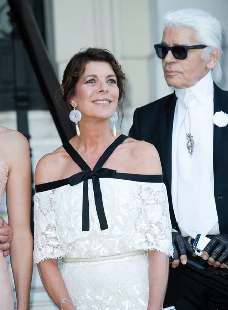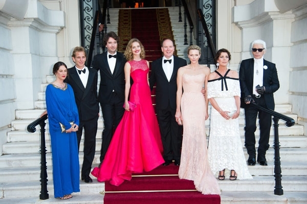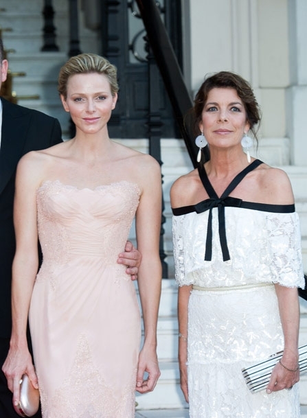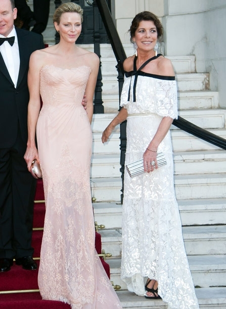 الأميرة شارلين أطلّت بماكياج خفيف وشعر مرفوع، بفستان رائع بلون مشمشيّ خافت صمّمته لها خصّيصاً دار Versace، وهو فستان طويل مطرّز بالدانتيل والكريستال من شواروفسكي. أما الأميرة كارولين فارتدت فستاناً طويلاً من الدانتيل الأبيض بحمالات وعقدة بالأسود من Chanel، بينما سطعت ناتاليا بفستان أحمر طويل من Dior Couture مع كلاتش مخمليّ أحمر.