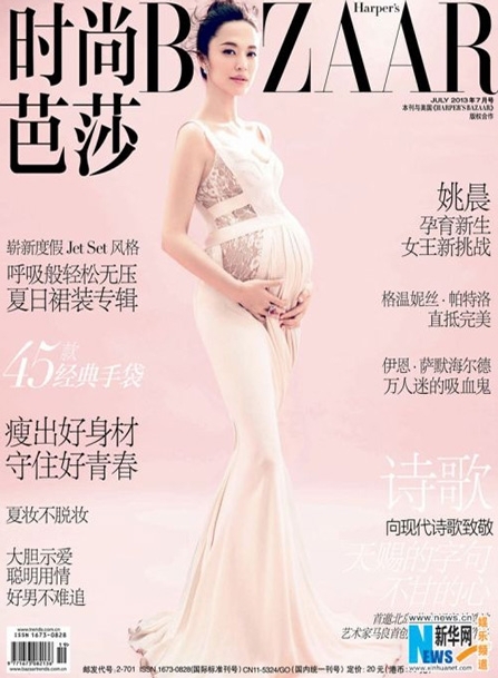 على غلاف مجلة Harper’s Bazaar أطلّت النجمة الصينية "ياو تشن" بكامل أنوثتها التي تنبض أمومة. ونشرت ياو الحامل بطفلها الأول صورة لها بفستان طويل زهري اللون صمّم خصيصاً ليتناسق مع بطنها المنتفخ الذي بدا واضحاً، اختارته من مجموعة ربيع وصيف 2013 للمصمّم اللبناني العالمي إيلي صعب.