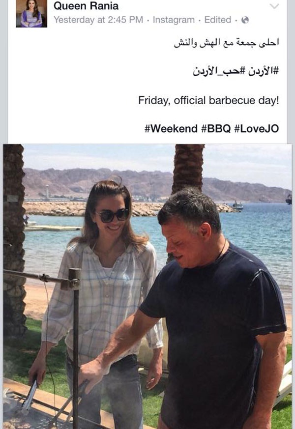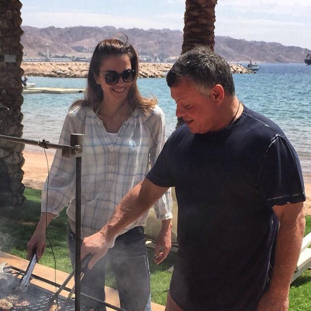 وظهرت الملكة وزوجها وهما يقفان أمام أحد المشاوي على ضفاف البحر يوجد البحر، وعلّقت الملكة على الصورة قائلة: «أحلى جمعة مع الهش والنش».