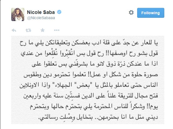 نيكول خرجت عن صمتها وبعثت رسالة قاسية لكل شخص لا يحترم ديانتها، حيث نشرت صورة تحمل هذه الرسالة المكتوب بها: "يا للعار عن جد، عن قلة أدب بعضكن وتعليقاتكن يلي ما راح قول بشو راح أوصفها، راح قول انقبروا وانقلعوا من عندي إذا ما عندكن ذرة ذوق، لأنه ما يشرفني بس تعلقوا على صورة أو عمل!! تعلموا تحترموا دين وطقوس الناس حتى تعاملوا بالمثل يا بعض الجهلاء، شكراً للناس المحترمة ياللي بتحترم حالها وبتحترم ديني مثل ما أنا بحترمهم، بتخايل وصلت رسالتي".