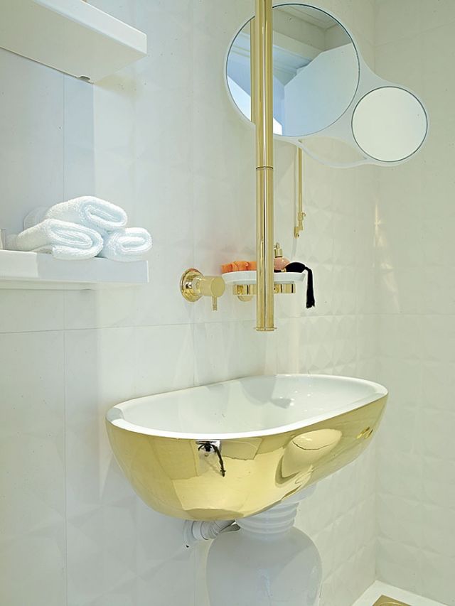 وقبل الانتقال إلى جناح غرف النوم، يستوقفنا حمام الضيوف الناصع البياض، ذات المغسلة المذهّبة حيث تنساب المياه بقسطل مذهّب أيضاً من السقف.