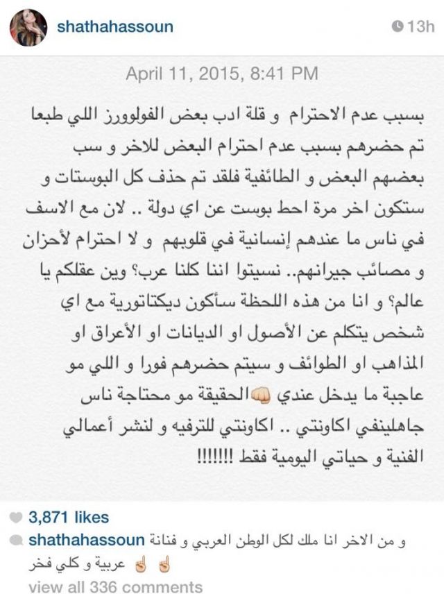 وأتبعتها بصورة أخرى أقرت فيها عن حذفها كل ما سبق بسبب تعصب بعض الجمهور وأن أي كلام عير لائق سيكون سبباً في حظر صاحبه من قائمة أصدقائها.