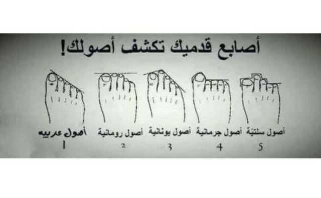 انتشرت صورة تقارن بين خمسة أنواع من الأقدام المرقمة والمسماة بحسب طبيعة طول الأصبع الثاني مقارنة بالاصبع الكبير، بحسب دراسة أطلقتها مراكز طبية مهتمة بالتاريخ البشري. وتشير صورة القدم الأولى إلى أن من يملك مثل هذا الشكل للقدم فإن أصوله عربية، بينما مثل الشكل الثاني والذي يكون فيه الاصبع الثاني والثالث بطول الاصبع الأول قدم من أصولهم رومانية، أما الثالث فكان لأصحاب الأصول اليونانية وتميز بطول الاصبع الثاني مقارنة بالاصبع الكبير، فيما كان الاصبع الكبير هو الأطول في أقدام ذوي الأصول الجرمانية والتي تعني " الألمانية". أما من كانت أصولهم سلتية (مثل الساكنين في الجزر البريطانية) فإن تشكيل أصابعهم كان غريباً بعض الشيء حيث جاء الاصبع الثاني في المقدمة من ناحية الطول، بينما تساوى الاصبعان الأول والثالث، تلاهما الرابع والخامس.