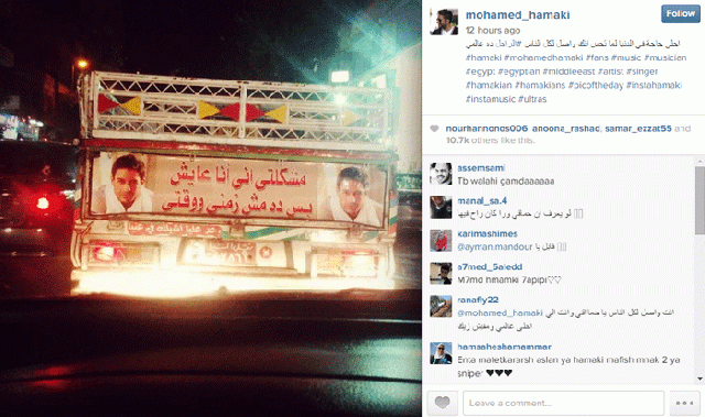 نشر المطرب محمد حماقي صورة، عبر صفحته الرسمية بموقع الصور الشهير إنستغرام، لإحدى سيارات النقل وهي تضع على خلفيتها صورة حماقي، وبجانبها كلمات من أغنيته الشهيرة "من ضيقتي"، وبالتحديد مقطع "مشكلتي إني أنا عايش بس ده مش زمني ووقتي".