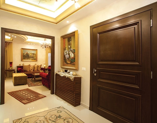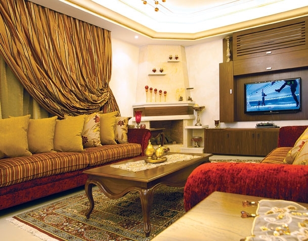 تزدان الجدران بلوحات عربية منسّقة بأعمال وأطر ذهبية متناغمة مع أعمال المفروشات في الصالونات. وتبرز قطع السجاد العجمي الفاخر بحجمه الكبير الموزّع أرضاً كلوحات متناغمة الألوان مع الأثاث.