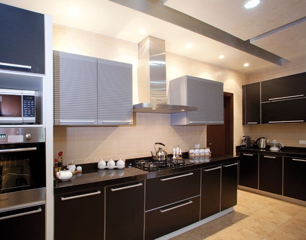 أما المطبخ فغاية في الأناقة والرّوعة بطرازه العصري ولونه الأسود والرمادي. وهو يتضمن فتحة تصل بينه وبين غرفة الطعام للخدمة وتسهيل الحركة بينهما.
