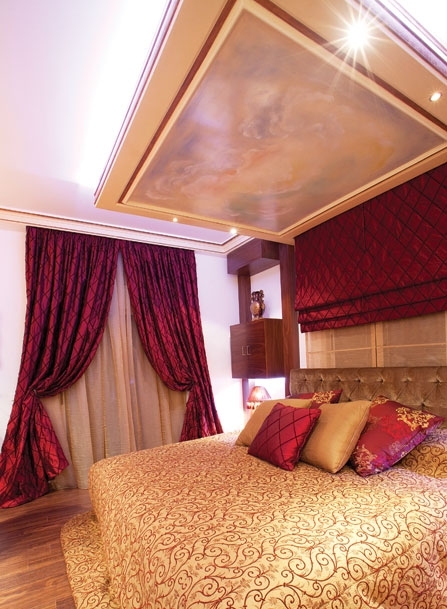 وفي غرفة النوم «الماستر»، تعمل الستائر على الريموت كونترول بطريقة عمودية. هنا يبرز اللون العنّابي الذي يتناغم ولون غطاء السرير.